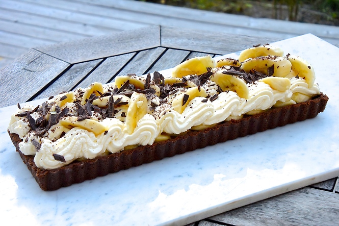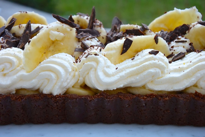 - Spritsa grädden ovanpå bananskivorna och toppa med mer banan och den hackade chokladen.