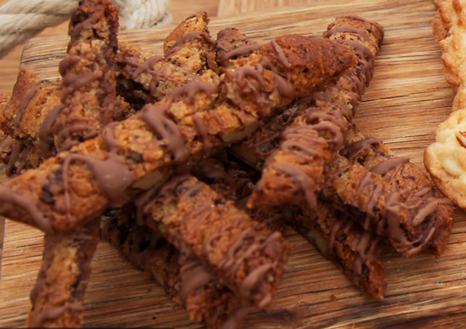- Skär kakan i smala snitt medan den forfarande är varm, placera på galler och låt kakorna svalna.