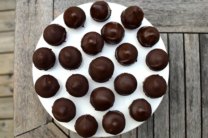 - Låt torka ca. 20min och doppa sedan i mörk choklad (gärna tempererad)