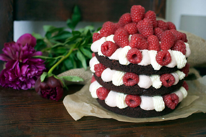 - Vispa ganachen tills grädden tjocknar och den är len och fluffig, spritsa toppar av hallonganahce varvat med vit chokladganache och hallon mellan bottnarna och ovanpå tårtan.