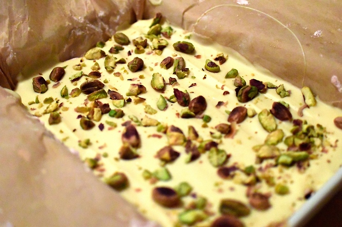 - 250 g mandlar och pistagenötter (+ extra till topping)