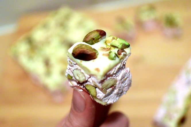 Mmmh! Mjuk, seg och ljuvligt god fransk nougat! Jag har aldrig varit ett fan av de hårda sakerna man kan köpa i butik, det känns alltid som att tänderna ska gå sönder när man tuggar på en sådan. Men den här franska nougaten blir lagom mjuk och fruktansvärt god.