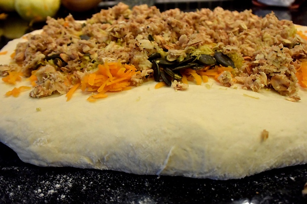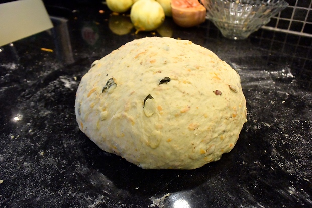 - Stjälp upp degen på bordet och platta till den tillsätt skållningen, citronen och de rostade pumpafrönen. Vik ihop degen och knåda för hand tills smaksättningen är jämt fördelad i degen.