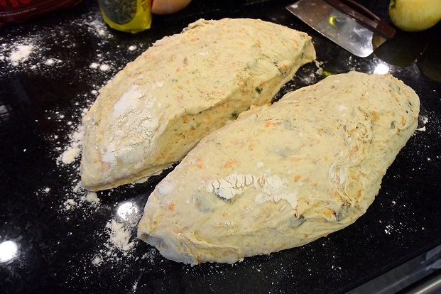 När degen är dubbelt så stor är den klar, du kan trycka lätt på den och studsar det tillbaka så är den färdigjäst. Försök att stjälpa ur den försiktigt utan att trycka ut för mycket luft och dela degen i tu med en degskrapa.