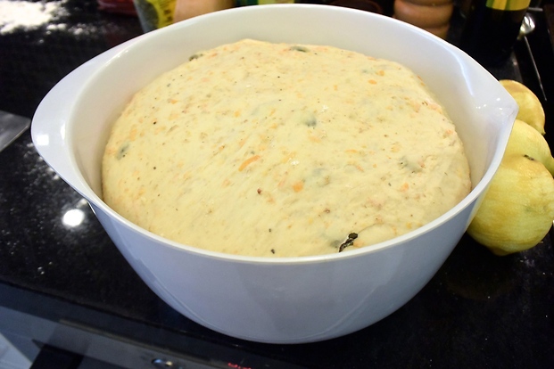 Knåda in smaksättningen i brödet. Genom att knåda degen först och sen tillsätta pumpan och resten så får du en jämn och snygg deg med välfördelade citron, havre och pumpa i slutändan.