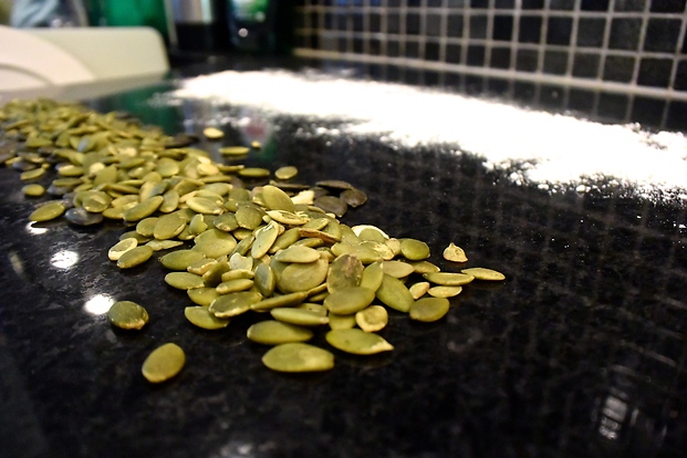 - Rosta hälften av pumpafrönen i en torr panna och låt svalna.