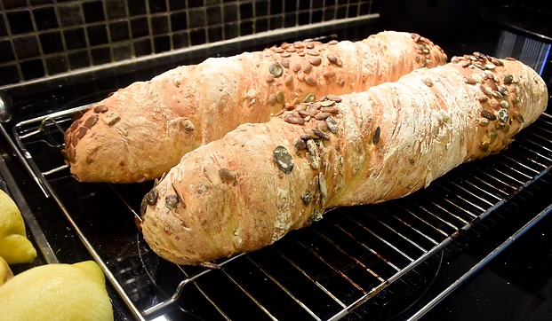 - Dra över bakplåtspappret med baguetterna på bakstenen och grädda mitt i ugnen ca 30min för stora och 20min för små baguetter. Sänk temperaturen till 220°C efter 15min.