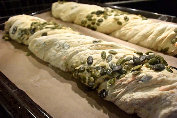 Förbered en radda med pumpakärnor, en med mjöl och en tallrik med vatten på bakbänken. Doppa ena sidan av brödet i vatten(det fungerar som lim) och sen i pumpa kärnorna, vänd sedan brödet för att doppa andra sidan i mjölet (inget dopp i vatten). Vrid baguetten ca 2 varv och lägg på en plåt med bakplåtspapper.