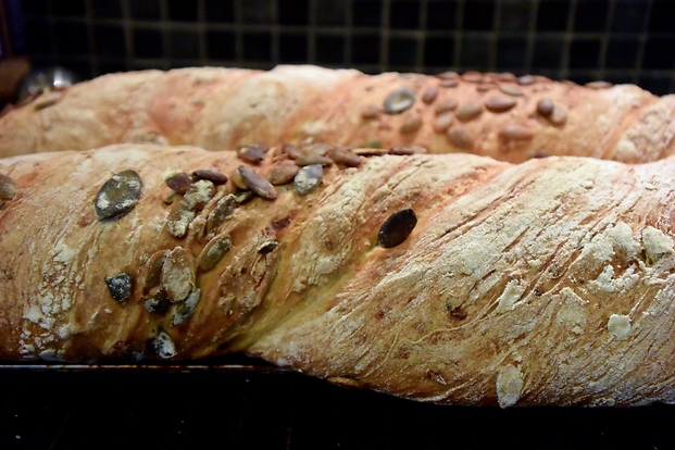 - Doppa ena sidan i vatten och sedan i de orostade pumpafrönen. Vrid sedan baguetten ordentligt och lägg på en plåt med bakplåtspapper. Upprepa med de resterande baguetterna.