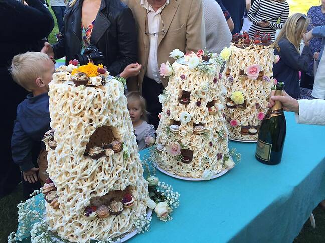 Här står våra tre spettekaketorn, mitt, Annas och Linus. Det är helt klart något av det knasigast jag bakat! Men för er som är nyfikna var munsbitarna i min; Chokladtarteletter med nougatmousse och rostade mandelspån samt chokladspån, tarteletter med syrlig halloncurd, grädde och färska bär, citronmadeleines med vit choklad- och cointreauganashe och till sist spettekaksbitar doppad i chokladglasyr och rostad mandel.