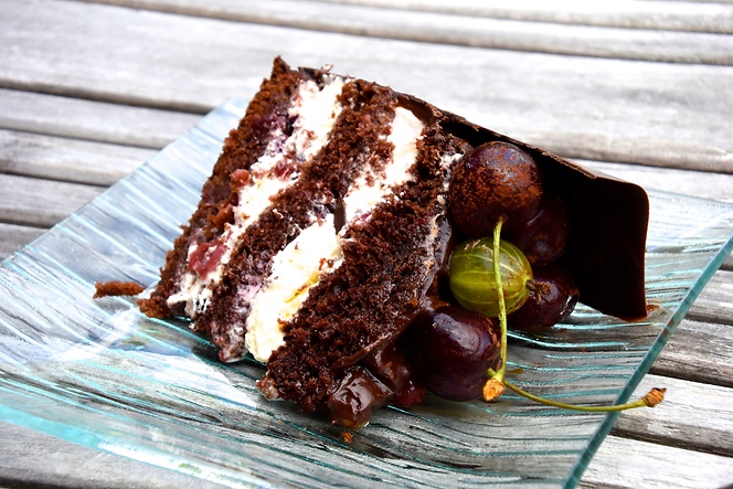 Choklad, choklad, choklad och lite grädde, och körsbär. Den här tårtan har en ultimat smakkombination med mörk chokladenbotten och chokladganache som bryts av med frisk grädde, söta körsbär och pigg kirsch. Whats not to like?