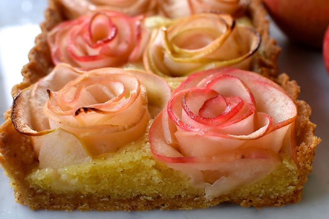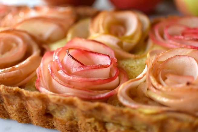 - Lägg äpplerosorna ovanpå mandelsmeten och pensla med sockerlagen.