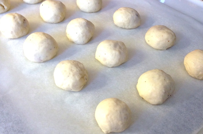 - Dela sen degen i golfbollstora delar och lägg på en bakplåt, täck och jäs ytterligare 1h.