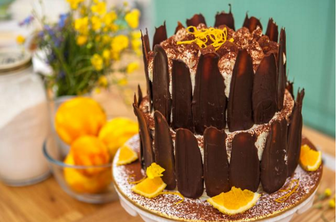 - Sätt chokladtungorna runtom tårtan (pudra med kakao precis innan servering)